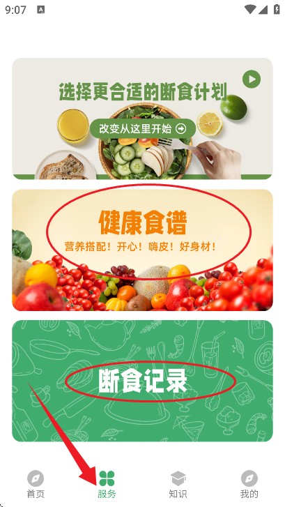 3、然后用户就可以在软件的【服务】中获取各种健康的营养食谱以及记录自己的断食记录。