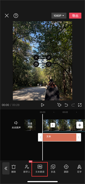 输入完成后,点击保存按钮(通常是一个对号图标),保存好文本。此时可以看到文本框出现,并且下方会出现删除、数字人、文本朗读、多选等功能。