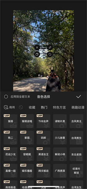 点击【文本朗读】,进入到文本朗读的页面。这里会有多种音色供你选择,包括热门音色、特色方言、萌趣动漫等不同类型的音色。