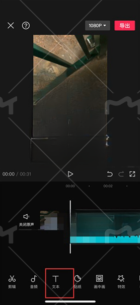 上传成功后进入编辑视频的页面,在页面下方的功能栏中点击【文本】选项。