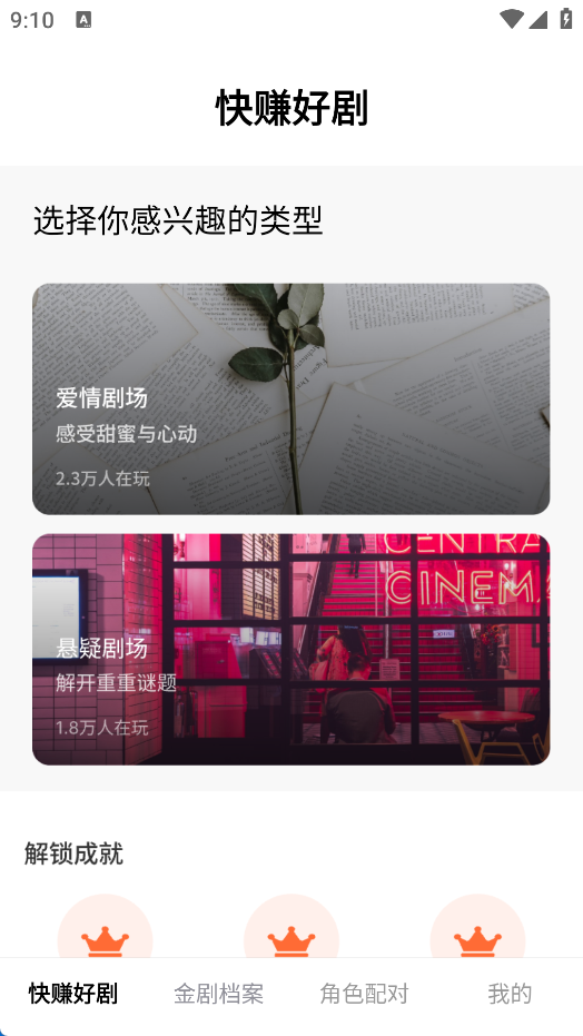 1、在首页可以选择你喜欢的类型,进行解锁,主要包括爱情剧场和悬疑剧场;