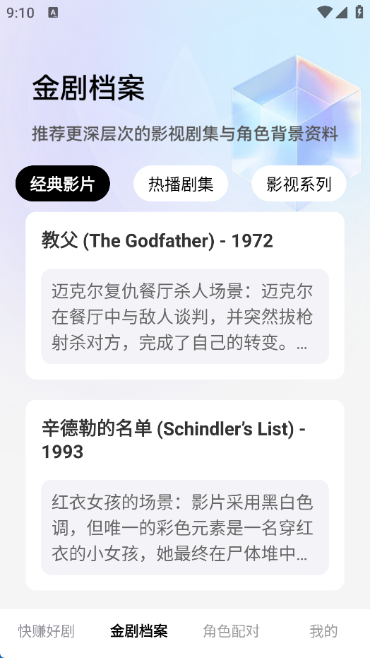 2、“金剧档案”带来专业梳理,呈现角色背景、故事结构与隐藏彩蛋,让每一部剧都更立体、更耐看。而在“角色配对”中,只需轻松测试,系统就会为你匹配一个最适合你的剧本角色,也许你就是某部剧中未被发现的“主角光环”。