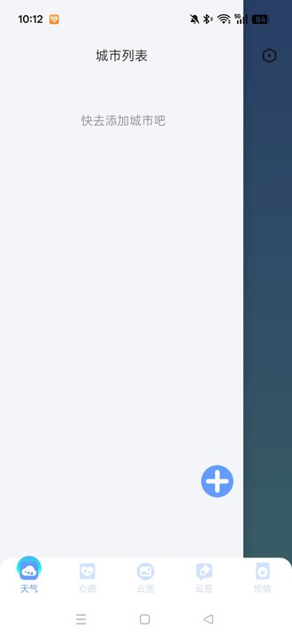 2、在首页天气功能页面点击左上方的+选项,进入城市列表。