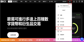 登录 OKX 交易所网页版后,找到右上角的人头图像,点击后选择下方的「子帐户」