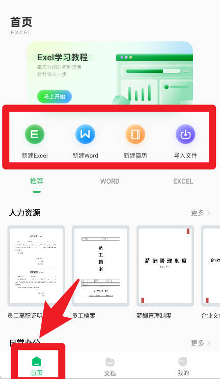 2、在首页中可以选择新建Excel、新建Word、新建简历或导入文件,快速开启所需的办公操作。