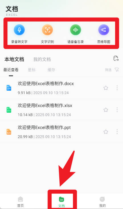 4、点击文档模块,可以使用录音转文字、文字识别、语音备忘录和思维导图等功能,管理和扩展办公需求。