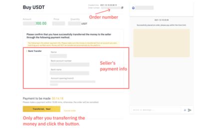 7.交易完成后,点击【已转账,下一步】,并点击【确认】。确认后,您的交易状态将更新为“待放行”,且卖方将在确认收到付款后放行加密货币资产。交易完成。您始终可使用页面右侧的聊天窗口与卖家进行联系。