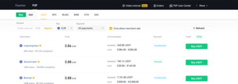 4.您需在【购买】选项卡中选择一个稳定币,如USDT,并浏览C2C卖家提供的列表。您可以通过指定金额、法币和付款方式在列表中进行筛选。点击【搜索】按钮。