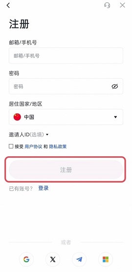 步骤二:根据提示填写注册信息,包括邮箱或手机号、设置密码、选择居住国家/地区等(邀请人ID为选填项),勾选“接受用户协议和隐私政策”,然后点击“注册”。
