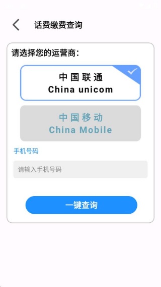 2、进入到一键查询的界面,选择运营商,输入手机号码就可以查询操作。