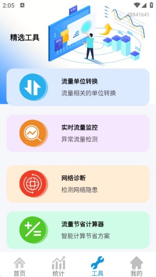 4、精选工具免费去使用,有流量单位转换,实时流量监控,网络诊断,流量节省计算器。