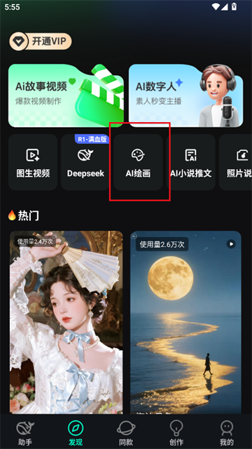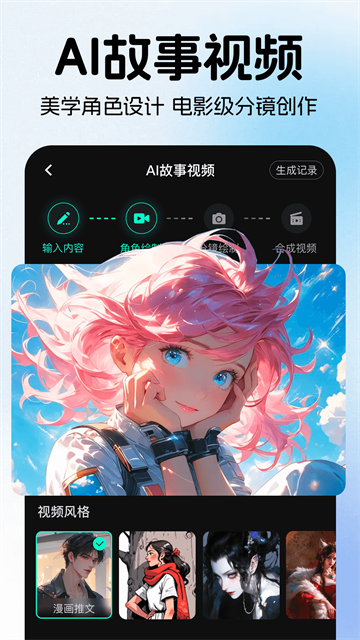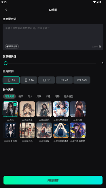3、点击AI绘画进入,输入您心中的画面描述,选择自己喜欢的创意风格,点击开始创作即可