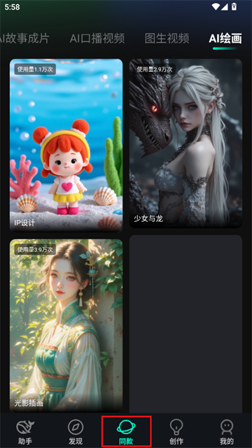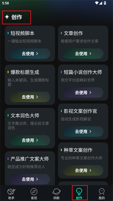 6、在创作页面,为大家提供了不同场景下载的创作功能,点击进入就能使用