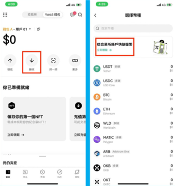 从主页点选接收,进入后点选从交易所帐户快捷提币,就可以直接从OKX 帐户转帐到Web3 钱包。