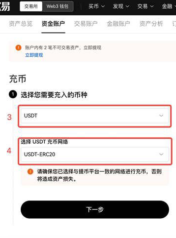 2、选择您需要充入的币种【USDT】选择USDT可用的充币网络【USDT-ERC20/USDT-TRC20/USDT-OKTC】【下一步】;注意:选择充值USDT币种时,此地址只能充入Tether(USDT),请勿充入其他币种,否则您充入的资产将无法找回。