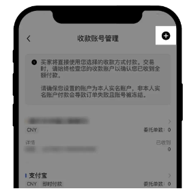 点击右上角“+”—【选择货币】、【收款方式】—可选择银行卡/支付宝/微信支付三种方式,按要求填写相关信息和提示即可完成绑定。