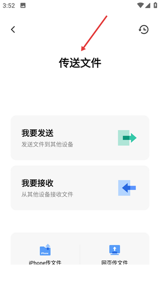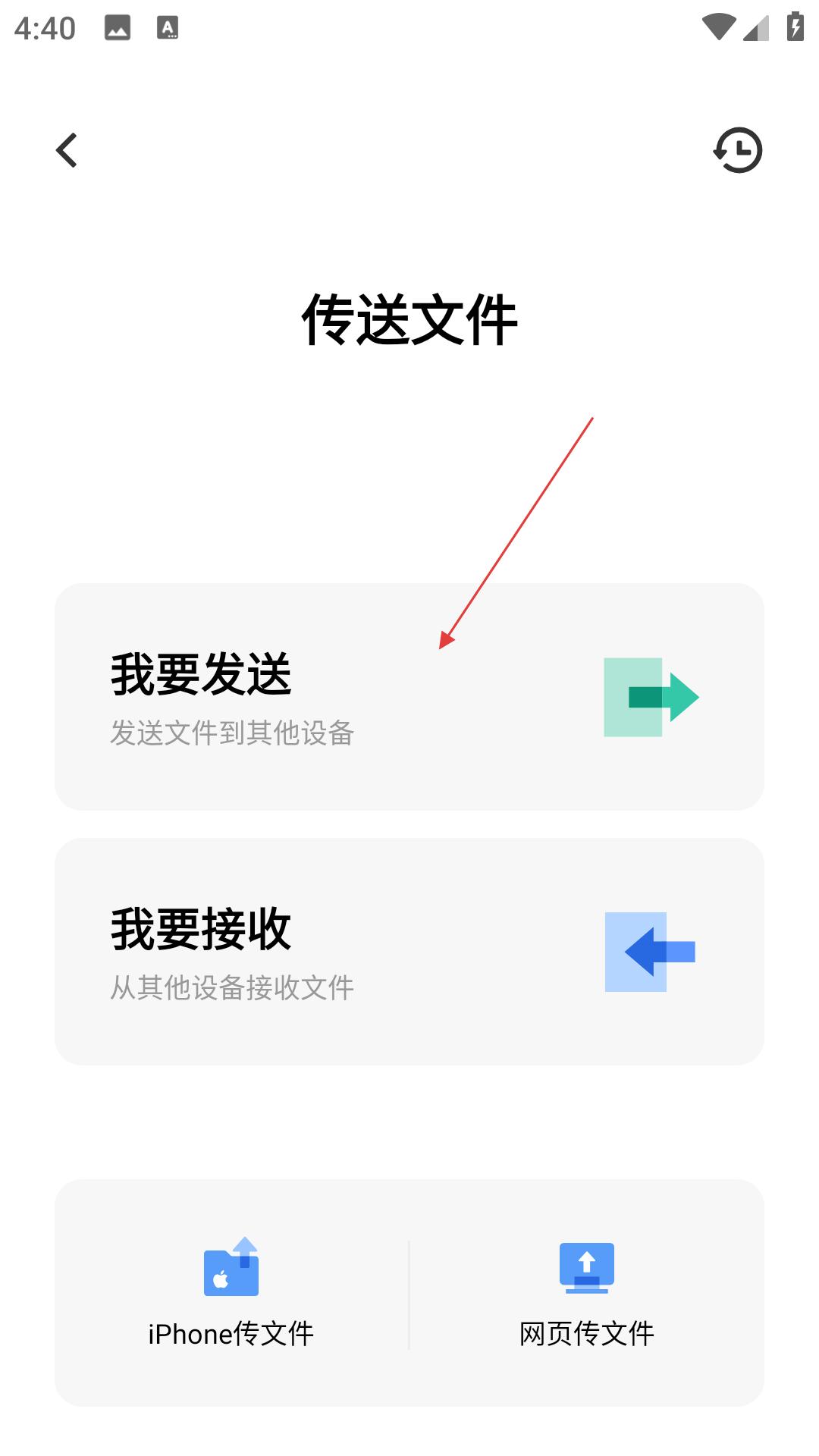 3、传送文件界面,分我要发送、我要接收选项,实现设备间文件传输,还支持与iPhone、网页端传文件。