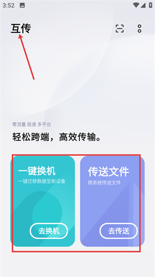 1、互传主界面,支持零流量跨平台传输,提供一键换机、传送文件功能,分别完成设备数据迁移与文件跨系统传输。