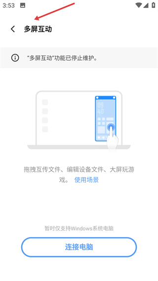 4、多屏互动界面,提示功能已停维护,原支持拖拽传文件等操作,仅适配Windows电脑,可点击连接电脑关联。