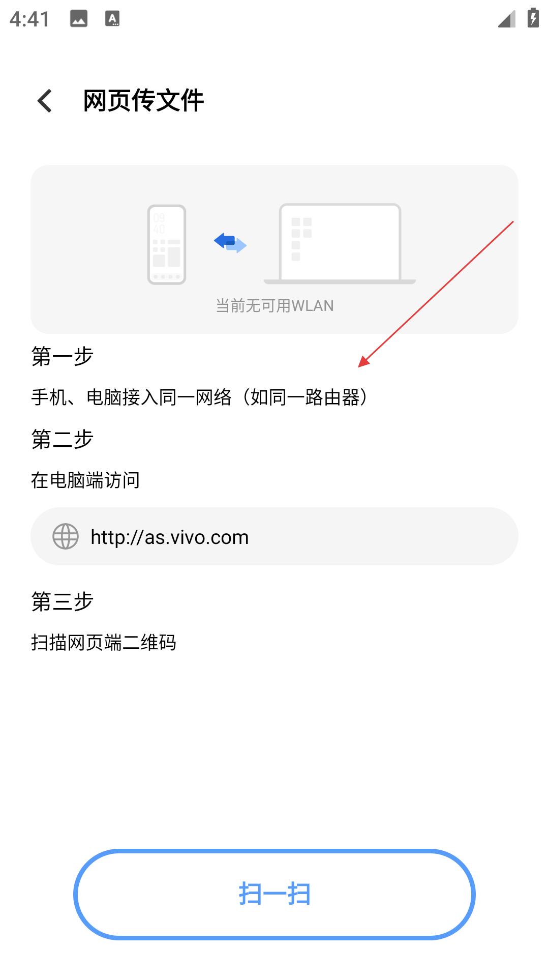 3、网页传文件页,按三步操作,手机电脑连同一网络,电脑访指定网址,扫描网页二维码,点扫一扫执行第三步。