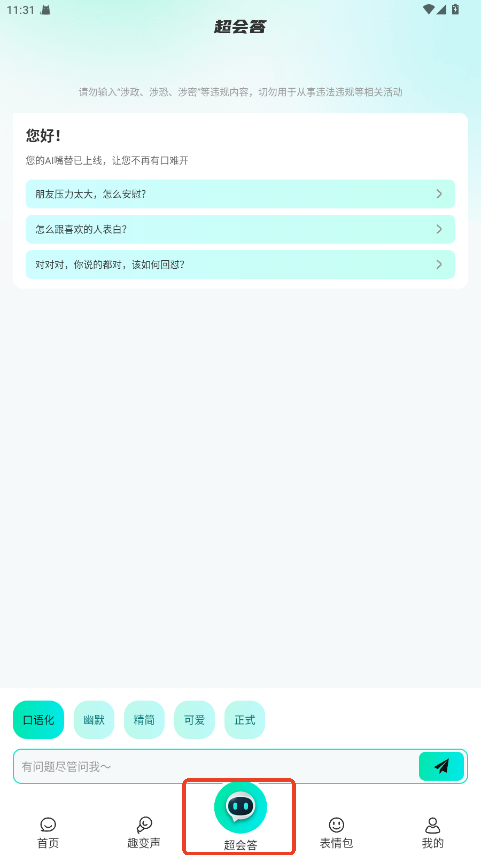 不仅提供了基本的文字输入功能,还融入了AI技术,为用户提供智能化的输入体验。并且也可以根据聊天场景自动生成多种聊天话题,并提供合适的回复建议。此外,它还提供了丰富的表情包和多种变声效果,使得打字聊天变得更加有趣和生动。