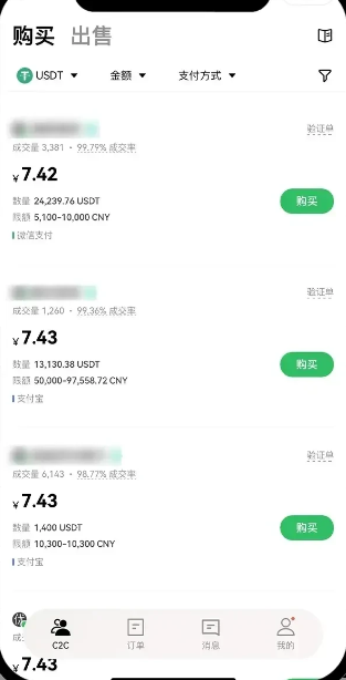 C2C 买币: 1)打开 App 首页,点击【买币】- 【C2C 买币】。在购买页面,点击【USDT】可以搜索数字资产,点击【筛选】可以选择委托单类型和支付方式。设置完成后,选出符合条件的商家,点击【购买】。