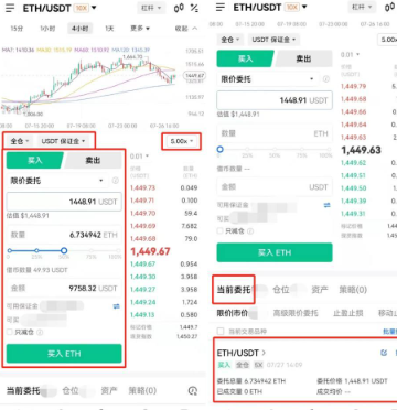 进入ETH/USDT杠杆交易页面,选择买入,选择全仓/逐仓模式,选择委托类型、保证金类型(USDT保证金)、杠杆倍数、交易价格,交易数量/金额,点击「买入ETH」按钮即可下单成功。挂单成交后,即可在仓位界面查看持仓相关数据,仓位可通过止盈止损、平仓、市价全平三种方式平仓。