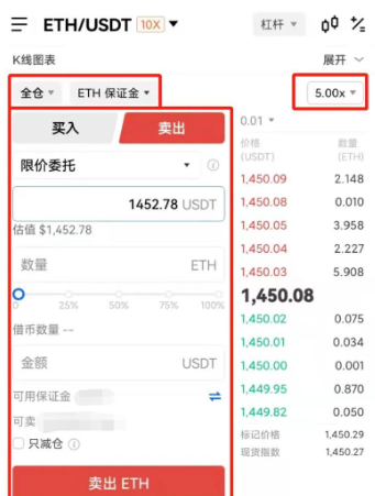 进入ETH/USDT杠杆交易页面,选择卖出,选择全仓/逐仓模式,选择委托类型、保证金类型(ETH保证金)、交易价格,交易数量/金额,点击「卖出ETH」按钮即可下单成功。挂单成交后,同样可以在仓位界面查看持仓相关数据。