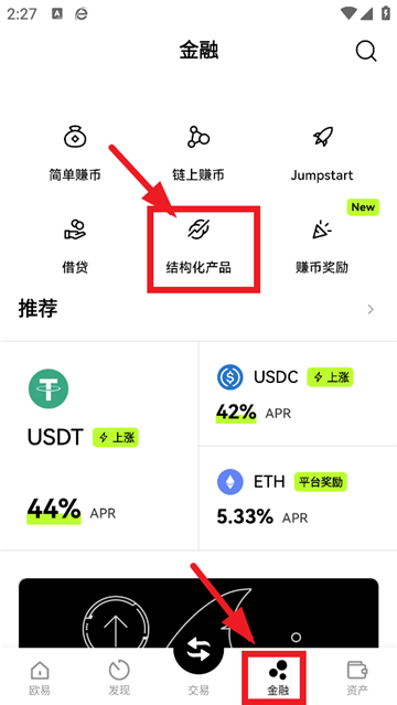 1、打开优币app,底部导航选择【金融】进入金融页面,点击【结构化产品】后,选择【海鸥】