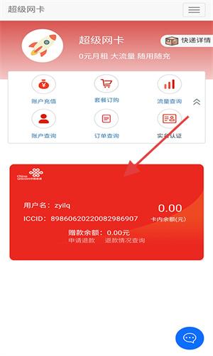 3、点击实名认证等功能后,弹出卡片信息框,显示用户名、ICCID、卡内余额等,助用户掌握网卡账户状态。