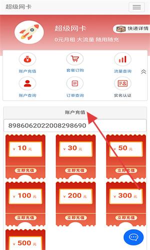1、展示账户信息、套餐订购等功能,账户充值板块罗列不同金额充值券,方便用户为网卡快捷充值。