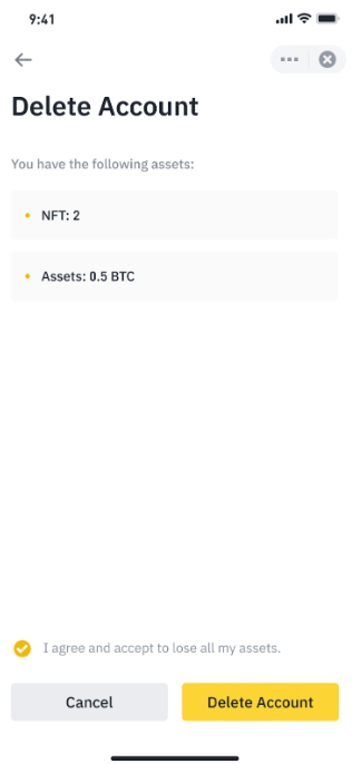 6.如果您的账户下仍有资产,可点击【取消】,先将资产转至其他账户。否则,您的资产将丢失,无法找回。勾选复选框进行确认,然后点击【删除账户】继续操作。