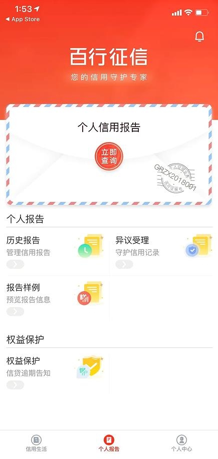 第三步:点击个人报告,选择立即查询,此时会显示剩余免费查询次数。