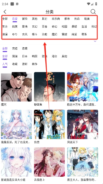 如图所示,根据题材、国家、人气等选择喜欢的漫画。