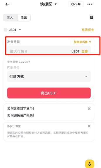 以USDT为例:打开币安APP首页,点击【快捷买币】—【去卖币】—输入【卖出数量】或【金额】—【出售USDT】—【确定】—选择收款方式,【确认出售】