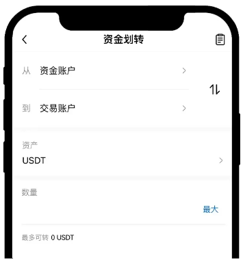 打开欧易 APP,点击【资产】—【资金划转】,选择币种以【USDT】为例 — 从【资金账户】— 到【交易账户】— 输入划转【数量】—【确定】。