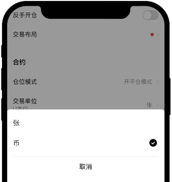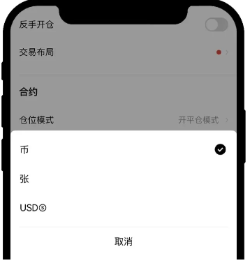选择相应的【交易单位】完成设置。永续合约分为USDT合约与币本位合约,其中USDT合约可选的交易单位为:币、张、USDT;币本位合约可选的交易单位为:张、币。