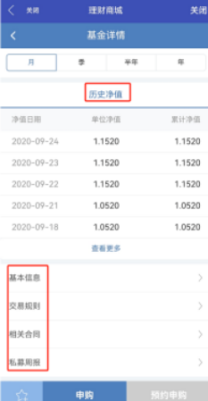 第三步,点击产品列表中具体的产品,显示产品详情,可以浏览产品的净值走势、历史净值、基本信息、交易规则、相关合同、私募周报等信息。