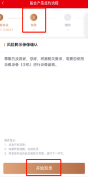 第十步,进入产品风险揭示的双录环节,点击“开始录像”。专业投资者无此环节。