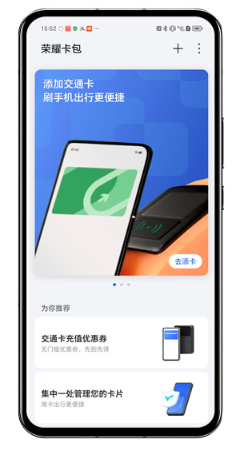 3、荣耀卡包可以存储交通卡数据,让用户在乘坐公共交通工具时直接使用手机完成刷卡。