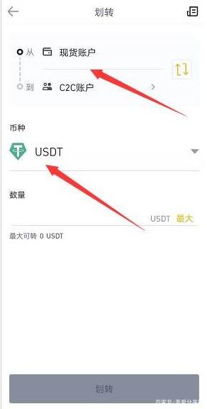2、在划转界面选择USDT币种,划转方式选择从现货账户到C2C账户。