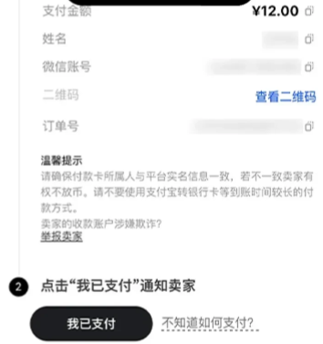 3)根据卖家提供的收款方式(银行卡/微信/支付宝),打开对应的第三方支付平台完成转账。转账完成后请务必回到交易页面点击【我已支付】,卖家才可以给您放币。