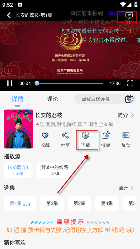 5、离线缓存,在视频详情页面,找到缓存按钮,选择想要缓存的集数和清晰度,即可将视频下载到本地,离线时在“我的缓存”中查看并播放。