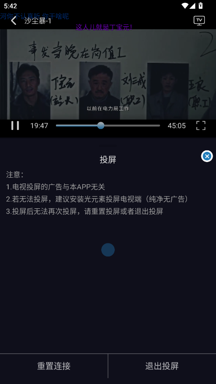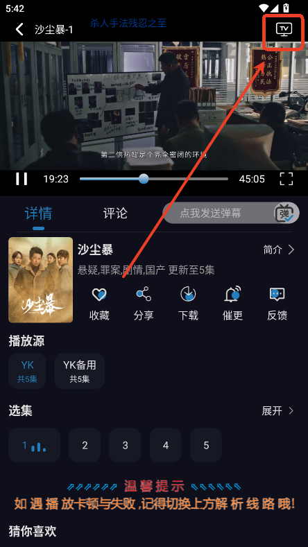 4、若想要投屏,点击播放页面的投屏按钮,选择对应的设备即可将视频投放到电视等大屏幕上观看。