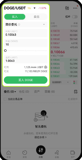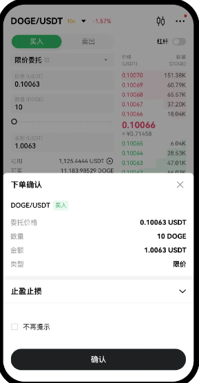 选择【买入】—【限价委托】— 输入【价格】、【数量】—点击【买入DOGE】,确认订单。