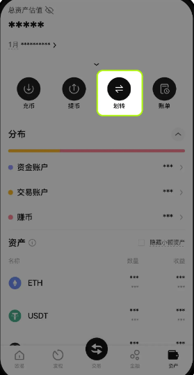 打开欧易 APP,点击【资产】—【资金划转】,选择币种以【USDT】为例 — 从【资金账户】— 到【交易账户】— 输入划转【数量】—【确定】。
