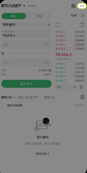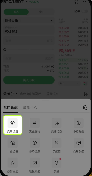 1、打开欧易App,进入交易页,点击右上角的【...】—【交易设置】;