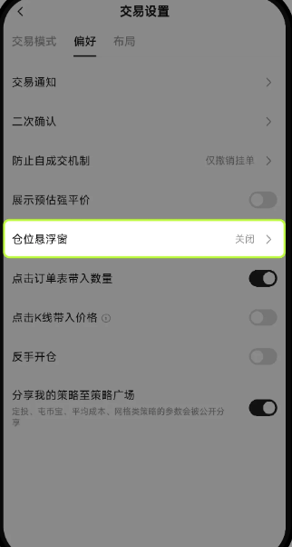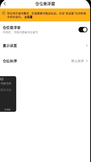 2、点击【仓位悬浮窗】,打开【仓位悬浮窗】按钮;