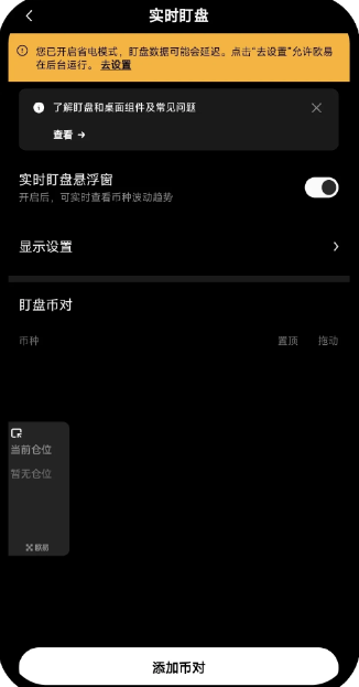 2、点击【添加币对】,选择您要盯盘的币种【保存】—打开【实时盯盘悬浮窗】按钮;