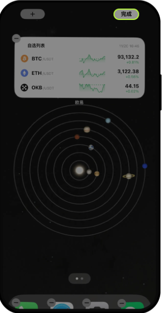 2、左右滑动选择“主流币”或者“自选列表”等内容,点击【添加小组件】—【完成】,即可完成主屏幕添加欧易小组件。